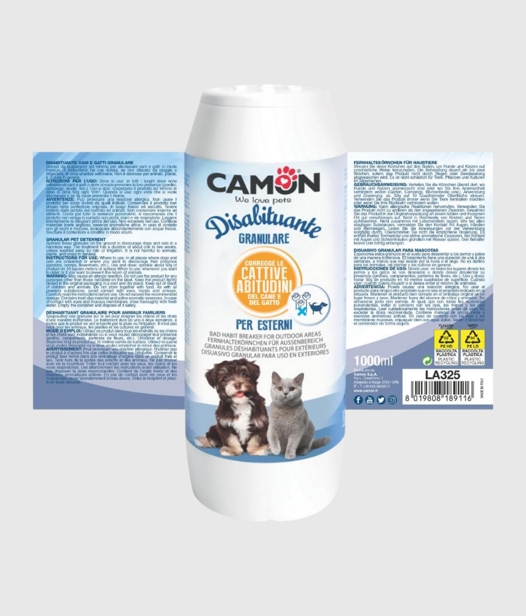 While sprays work well on hard surfaces, you need a different solution for your lawn and garden beds. The CAMON Disabituante Granulare is a powerful pet repellent in a long-lasting granule form.